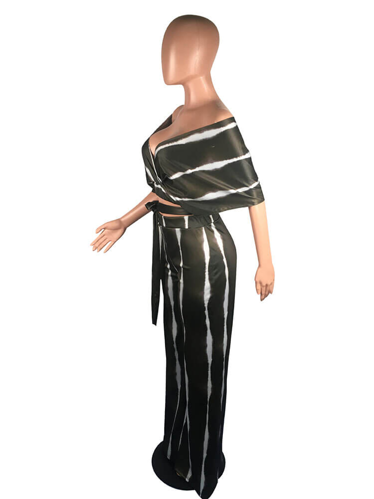 • Bottom: Wide Legs and Full Length. Elastic Waistband. Tie Belt. Stripe Print. High Waist.