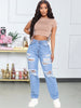 Feature: Denim. ripped. solid color. high waist. button. zip up. wide-leg jeans.