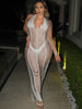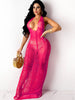 Feature: V neck. solid color. sleeveless. backless. see-through. hollow out. backless. maxi dress.