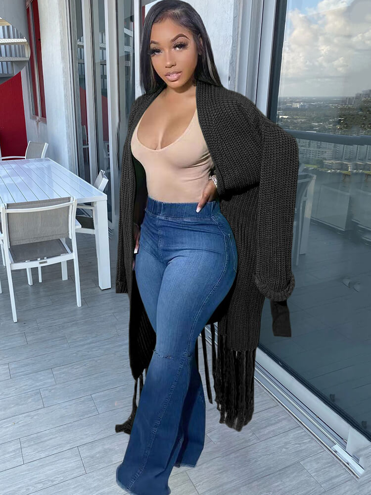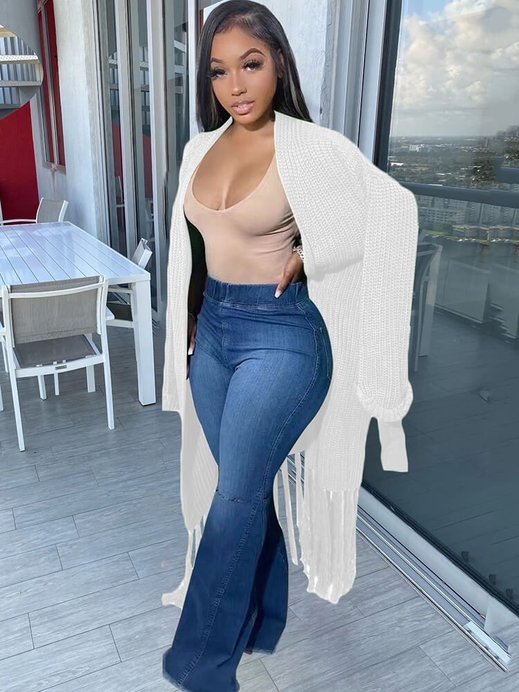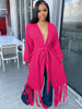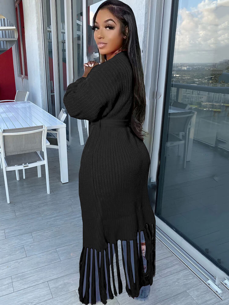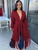 Feature: Long sleeve. solid color. v-neck. cardigan. tie up. bodycon. tassel. belt.
