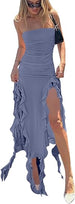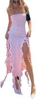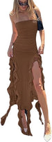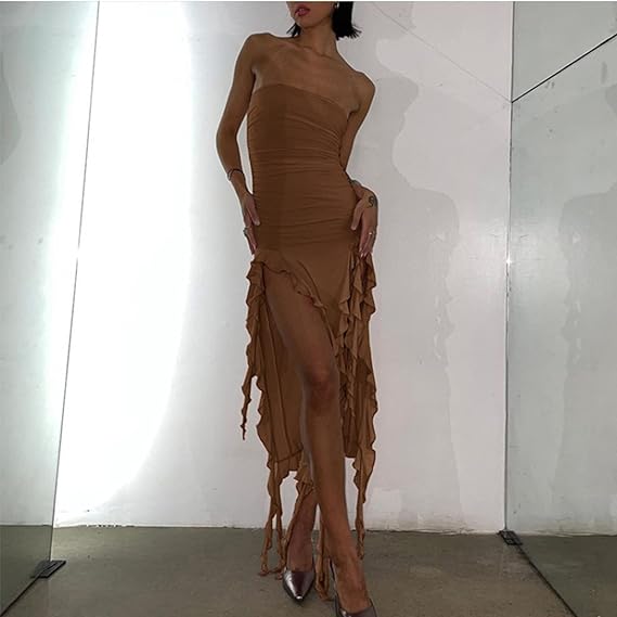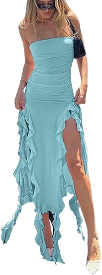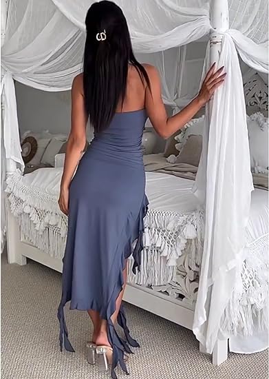 With its asymmetrical hemline and high split design. it not only flatters your figure but also pairs nicely with a jacket or cardigan.