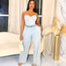 Features: Two-piece set. pants. strapless. zipper. crop top. off-shoulder. sleeveless. long pants. drawstring waist. high waist. wide-leg. solid color. denim. high elastic. loose.