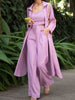 Features: No stretchy. three-piece outfits. sleeveless. crop tank top. long sleeves. buttons. long coat. solid color. long pants.